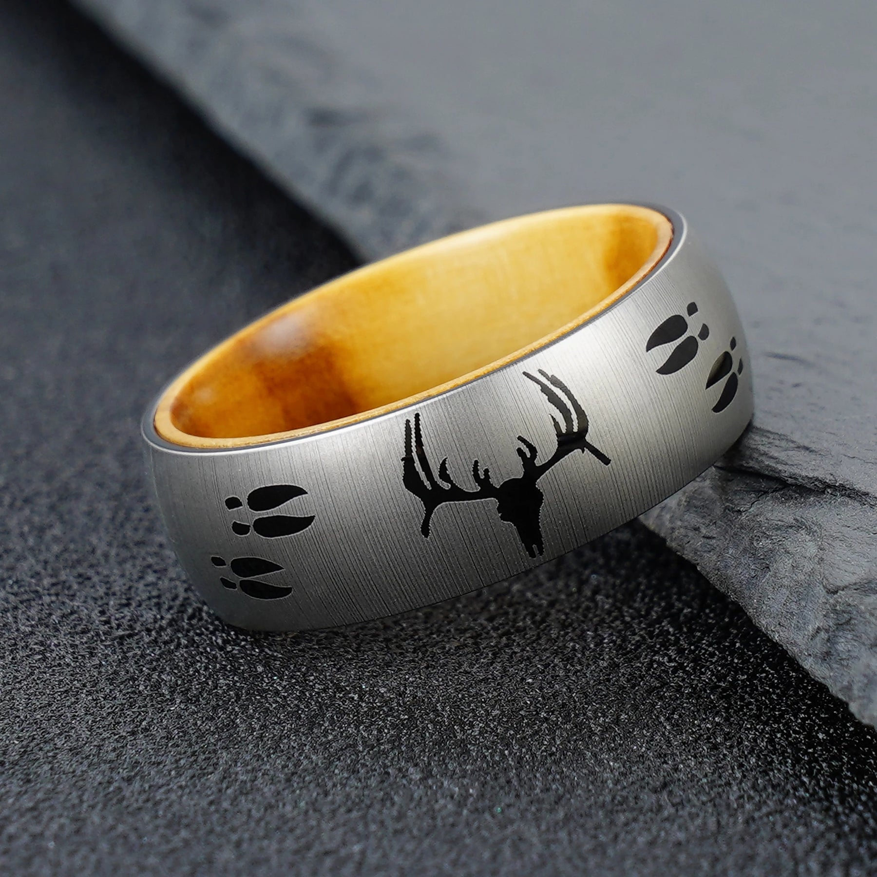 Crafted from high-quality stainless steel, this ring is highly resistant to scratches, corrosion, and everyday wear, ensuring it keeps its sleek black finish for years. The olive wood liner adds a warm, natural touch, while the precise silver deer engraving brings intricate detail and a unique personality to each ring.