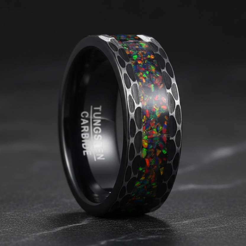 Forged from premium tungsten carbide, this ring is built for permanence. Scratch-resistant and solid, it balances industrial strength with refined artistry. The black edges frame the design with authority, giving the ring a clean, modern silhouette that stands apart without excess.