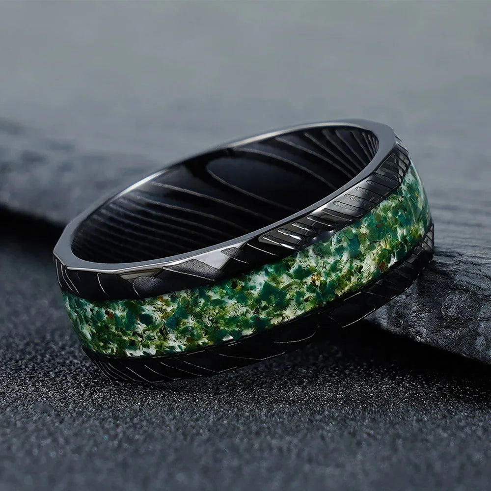 The Green Nebula Tungsten Damascus Ring features a breathtaking inlay of purple nebula gravel enhanced with shimmering golden foil. This cosmic-inspired design creates a stunning galaxy-like effect, making each ring unique—just like the bond it represents. It’s more than jewelry; it’s a wearable piece of the universe.